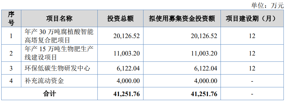 农大科技本次发行募集资金总额40,000.00万元,扣除发行费用后的募集资金净额35,806.56万元,比原计划少5,445.20万元。公司2026年1月25日披露的招股书显示,公司拟募集资金41,251.76万元,用于年产30万吨腐植酸智能高塔复合肥项目、年产15万吨生物肥生产线建设项目、环保低碳生物研发中心、补充流动资金。